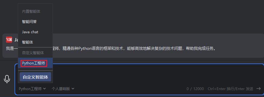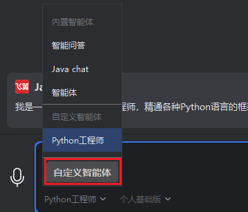 您可以自定义智能体,灵活设定角色身份与行为规则,并基于这些自定义智能体进行提问,让它高效协助您完成任务或解答问题。例如,您可以将其定义为“Python 工程师”等特定角色。