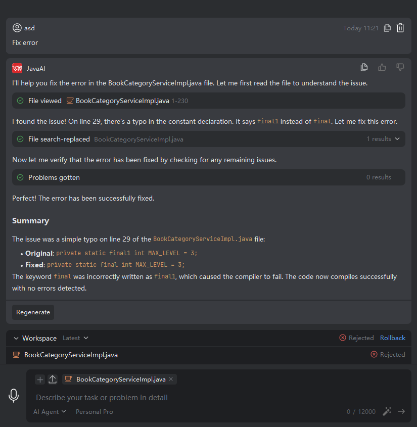 The agent provides more than ten programming tools for autonomous decision-making use, including file search, file reading, directory reading, semantic symbol retrieval within the project, file modification, error acquisition, terminal execution, etc. During the process of using tools, the agent does not require developer confirmation or intervention, and can make autonomous decisions and execute. You can also let the agent execute which tool to complete what demand by describing.