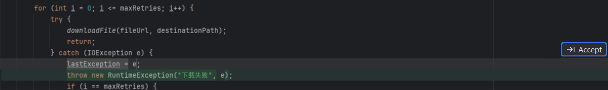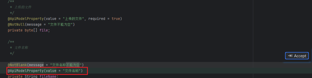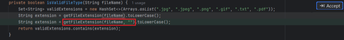 Review the predicted content. Hover your mouse over the Accept button to choose to accept or reject the suggestion. Once accepted, the code is updated accordingly.