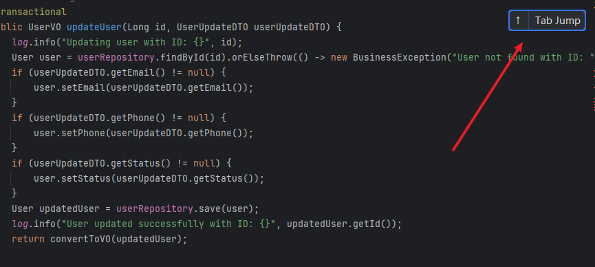 - If a suggested change is outside the currently visible area, a "Tab to Jump" button appears. Click it or press Tab to navigate to the next modification location.