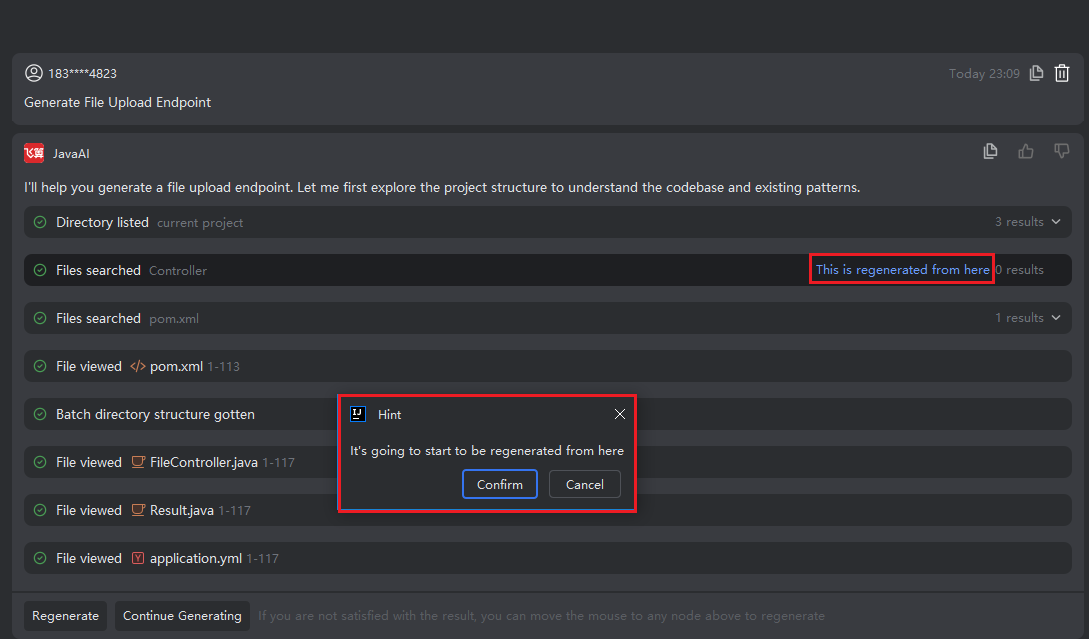 In Smart Guide and Smart Chat, after a task is executed, if you are not satisfied with the result, you can move your mouse over the corresponding node and click "This is regenerate from here" on the right to regenerate from that node.