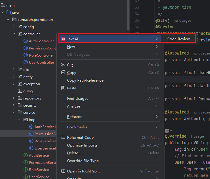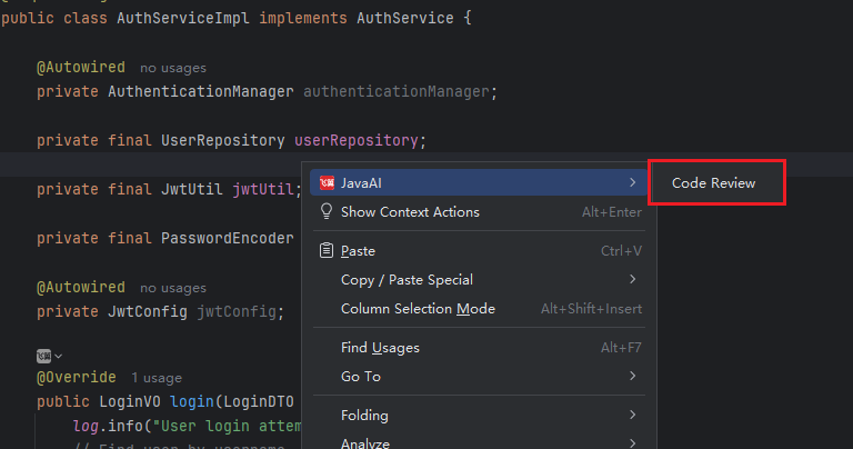 - Open the target file in the editor, right-click anywhere in the code area, and select JavaAI > Code Review.