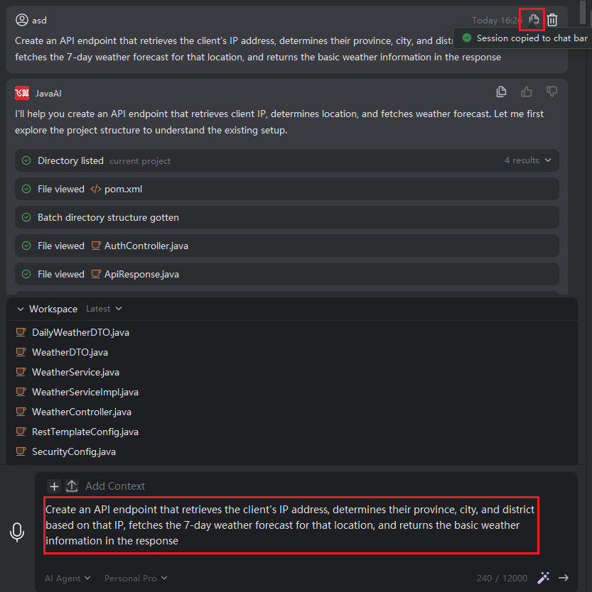 The Copy Conversation feature allows you to quickly copy the entire content of the current conversation and paste it into the input box, enabling you to edit or refine your request before resubmitting it. This is especially useful for iterating on previous prompts or rephrasing questions based on earlier context.