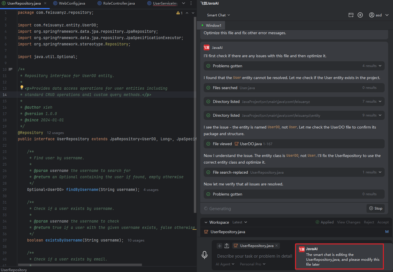 When an intelligent session is optimizing or adjusting a local project, if you simultaneously compile or modify the same file locally, the system will display a warning. At this point, the changes made by the intelligent session to the file are not yet confirmed. If you continue to modify the code locally, once the intelligent session task is completed, subsequent "Accept" or "Reject" actions may overwrite your local modifications. Please pay close attention to the file status to avoid losing your work.