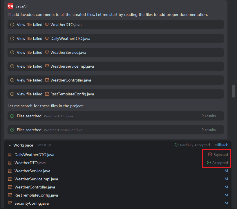 - All code modifications generated from the current snapshot are managed collectively. When you accept or reject changes in the workspace, the action applies to all related updates in a batch.