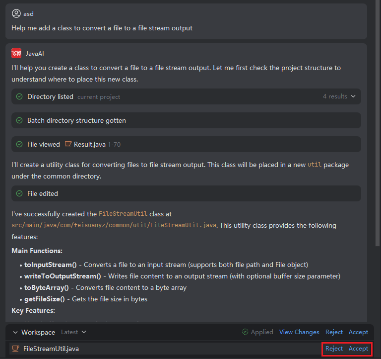 ⚠️ Caution: If files in the current workspace are interdependent (e.g., one class references another being modified), accepting only a subset may lead to compilation errors or runtime issues. In such cases, manual adjustments to related files may be necessary to maintain project integrity and consistency.