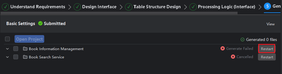If a module fails to generate, click Restart to retry. If this button is not visible, please wait for all other modules to finish generating, or click Cancel to make it appear.