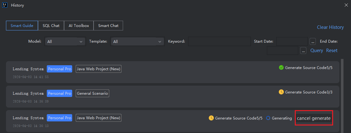 - After opening the history, select the task that is being generated and click "Cancel Source Code".