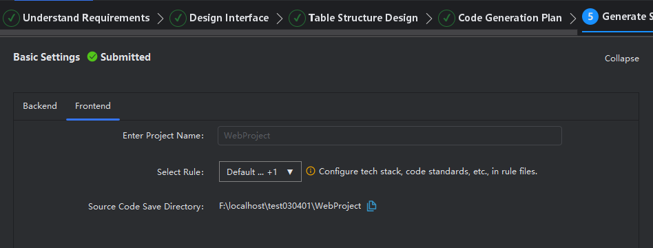 - Step five, after setting up the backend project, click Frontend to set the name and rules for the frontend project.