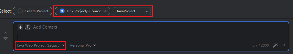 - In the first step when inputting the requirement description, select "Associate Project/Submodule", then select "Project" from the list. Then select "Java Web Engineering (Legacy Version)" mode.