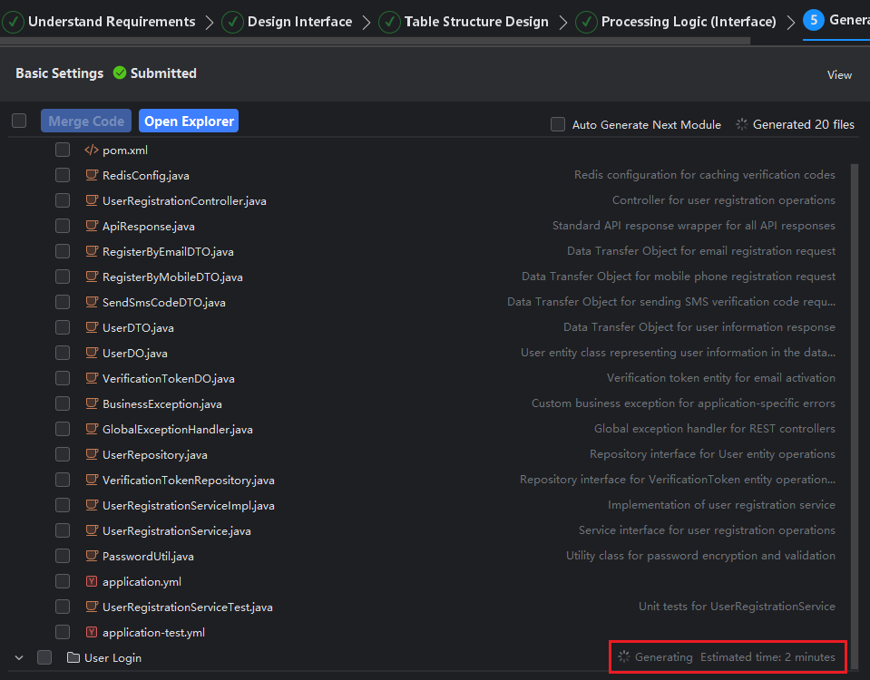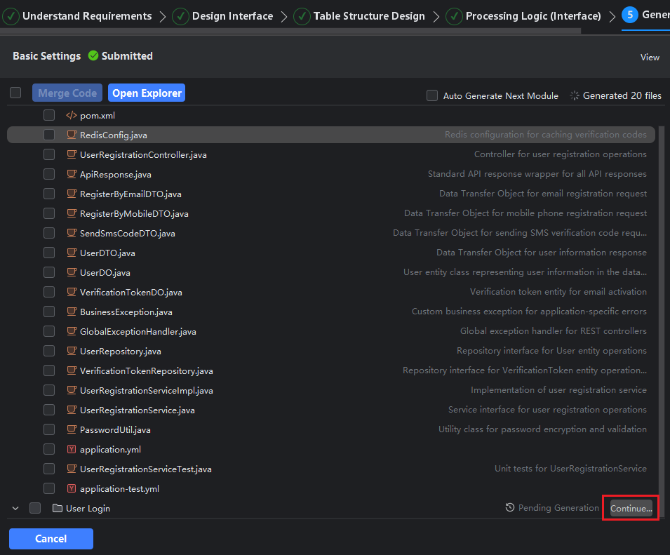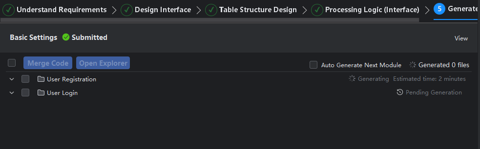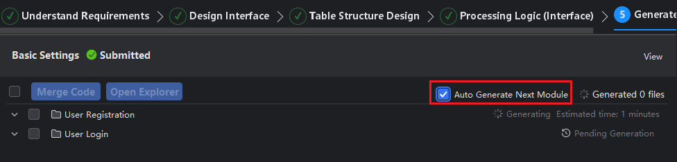 Description: Merging project source code is done module by module. After the first module is generated, you can choose which module's source code to generate next based on your needs, and click "Continue Generation" for the corresponding module.