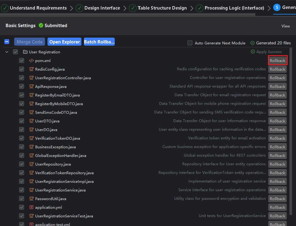 - After module generation is complete, click on the generated Java files to view their content, then check the required files and click "Merge Code".
