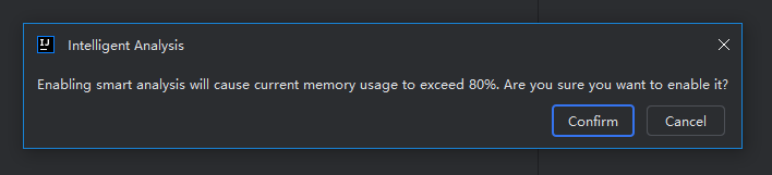 After checking "Enable Smart Analysis" or upon launching IntelliJ IDEA, the plugin will automatically evaluate system resources. If the sum of the "memory required for Smart Analysis" and the "current system memory usage" exceeds 80% of your total RAM, a warning prompt will appear. Please carefully decide whether to enable this feature based on your actual hardware conditions. Forcing it to run under high memory load may cause system lag and unresponsiveness, significantly degrading your development experience.