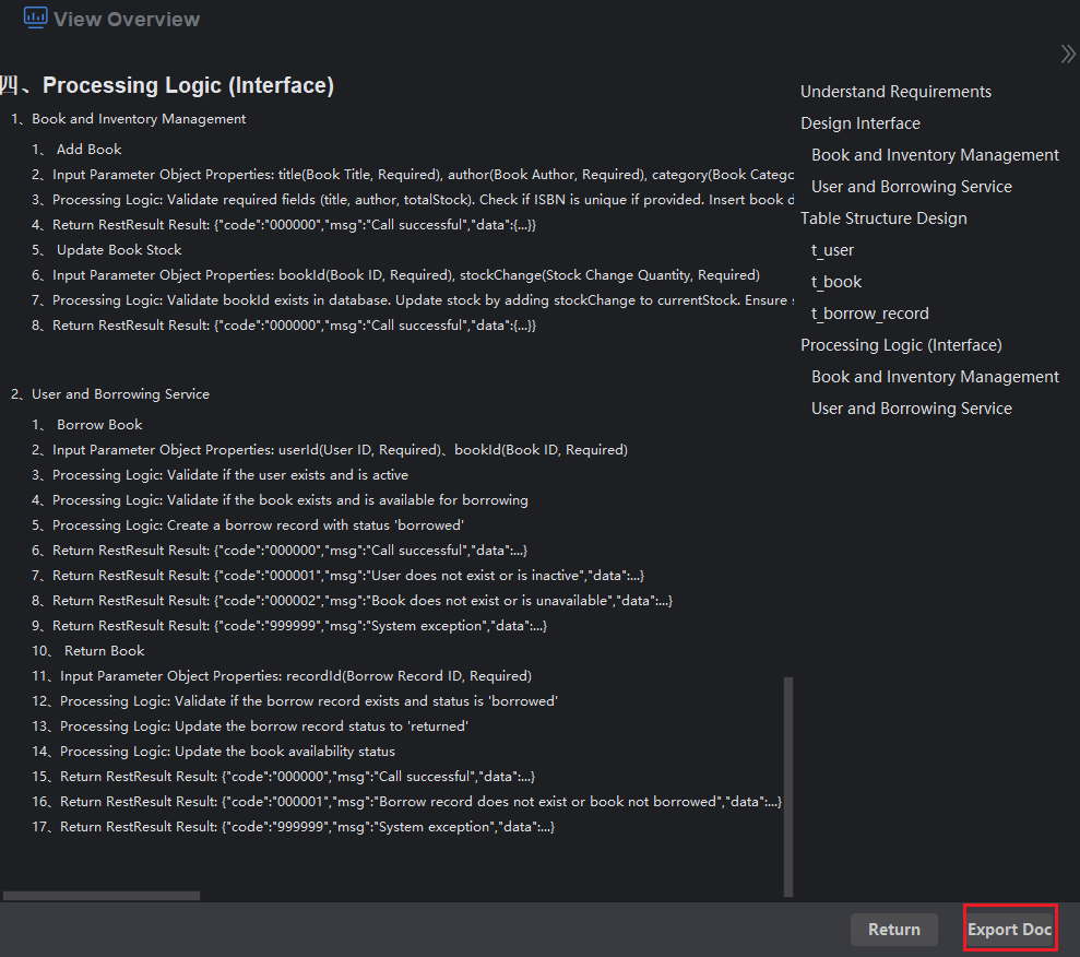 You can quickly export all content generated during the code creation process to a Word document for easy viewing in document format later. The export option is only available after completing the processing logic (interface), and you can also choose to export documentation when viewing the overview. This approach ensures the completeness and accuracy of the documentation, facilitating your further use and reference.