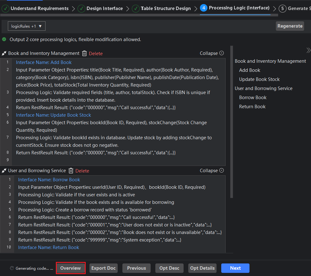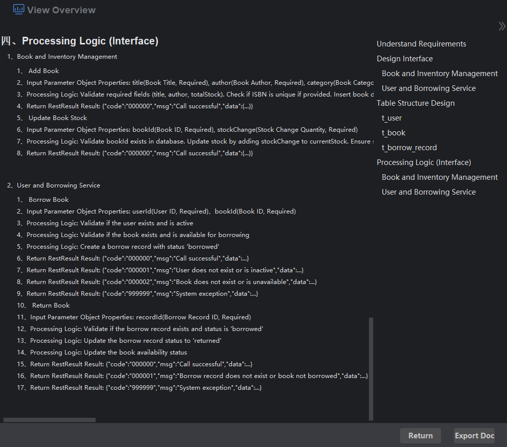 By viewing the overview, you can quickly review all content from the requirement stage to interface logic without having to return and check each step individually. Only after completing each step will the relevant content be displayed in the overview. This approach enables you to efficiently review the entire project's progress and details.