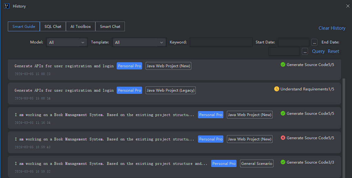Session history records will save previously generated source code. You can view original requirements, current task nodes and other related information by checking history records. This helps you track details and progress of each generation task.