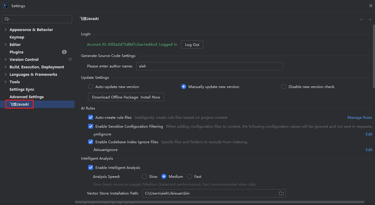 - Open "File > Settings" in the upper left corner of IDEA, then click "FeiSuan JavaAI" to enter the advanced settings page.