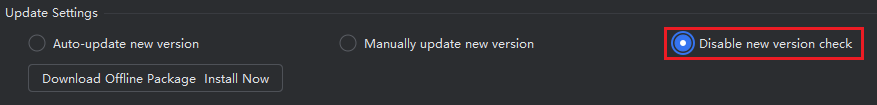 When configured to disable update check mode, if there is a new version released, you will not receive update prompts. However, please note that if you receive a prompt message saying "Current version is too low, please update to the latest version", it indicates that there is a mandatory new version that must be updated. In this case, the content of the new version is incompatible with the old version, and you need to upgrade to continue using it; otherwise, you won't be able to use it without updating. At the same time, it is not recommended to set it to disable update check. When defects are fixed or new version features are launched, you won't be able to get the latest feature experience.