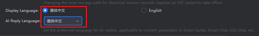 - In the Advanced Settings, you can set the display language for the Feisuan JavaAI plugin. Currently, "Simplified Chinese" and "English" are available. The changes will take effect after restarting IntelliJ IDEA.