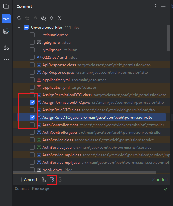 - In the git pending commit list, select the files to commit, then click the "Generate Git Commit Message" icon.