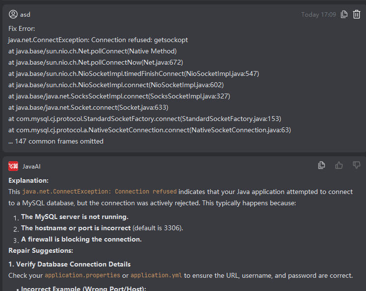 In IntelliJ IDEA, when running a program encounters an exception error, you can see the FeiSuan JavaAI quick action button in the standard output window. After clicking this button, FeiSuan JavaAI combines running code, exception stack traces, and other error context information to quickly provide you with troubleshooting ideas or repair suggestions in the smart Q&A area. This approach helps you efficiently locate problems and quickly take measures to correct them, significantly improving debugging efficiency and code quality.