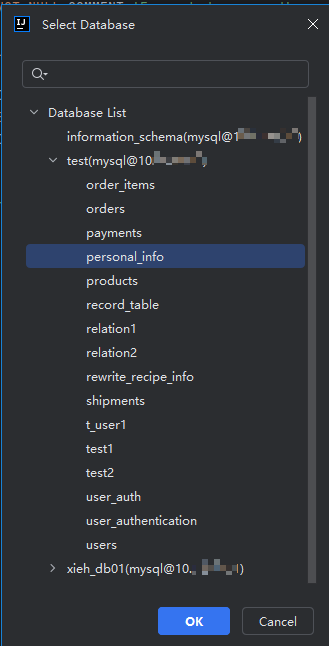 Note: If Database is not filled in the IDEA database management tool, all databases for the service will be displayed, as shown in the figure: