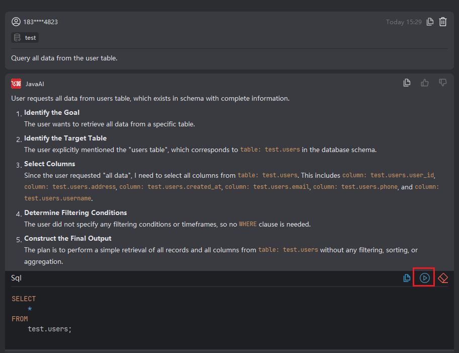 You can directly execute the generated SQL statement within the IDEA plugin and view the results to verify whether they meet your requirements.