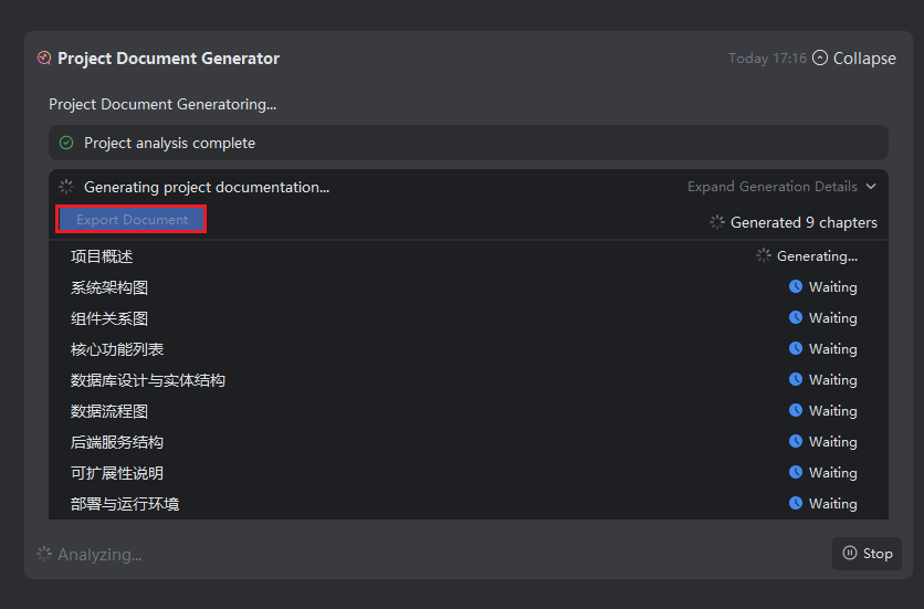 - Chapters marked as “Waiting” have not yet been generated—wait until all sections are complete before Export.