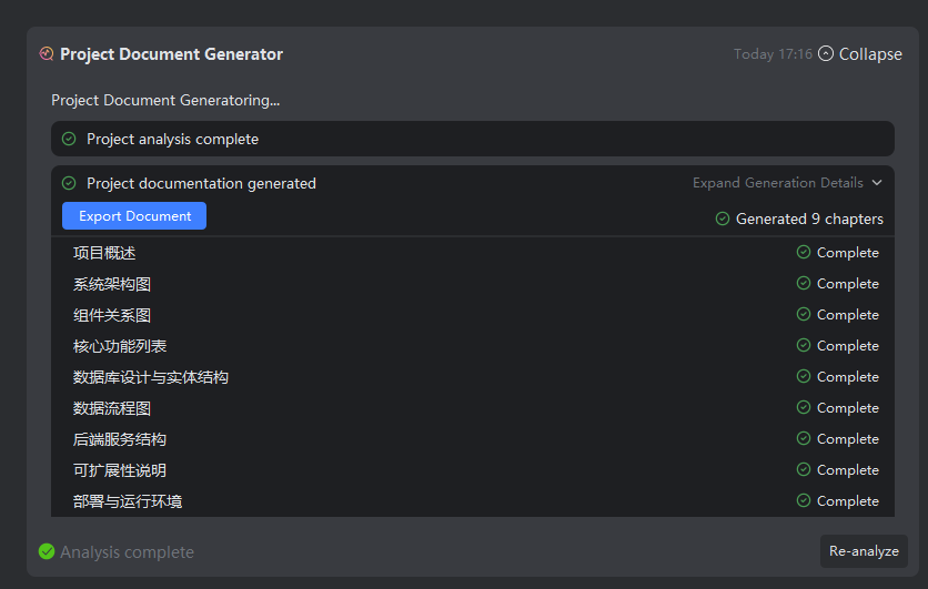 - The output is in Markdown (.md) format, synthesized from source code and configurations.