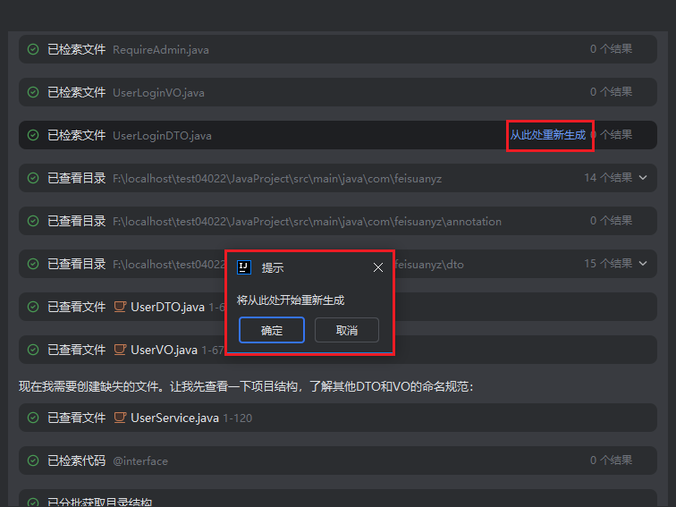 在智能引导、智能会话中,任务执行结束后,如果您对结果不是很满意,可以将鼠标移动到对应的节点,然后单击右侧“从此处重新生成”,即可从该节点中重新生成。