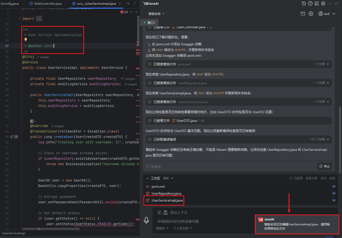 当智能会话正在对本地项目进行优化调整时,若您在本地同时对同一文件进行了编译或代码修改,系统将弹出提示。此时,智能会话对该文件的变更尚未确认。如果您在本地继续修改代码,一旦智能会话任务完成,后续执行的“接受”或“拒绝”操作可能会导致本地新增的修改被覆盖。请务必留意文件状态,以免丢失工作成果。