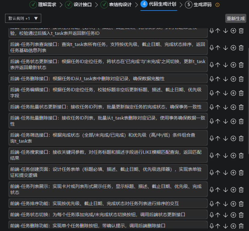 - 步骤四:代码生成计划,展示计划数量和实现功能。