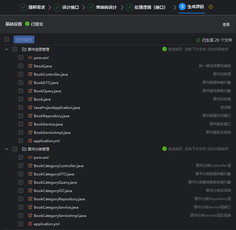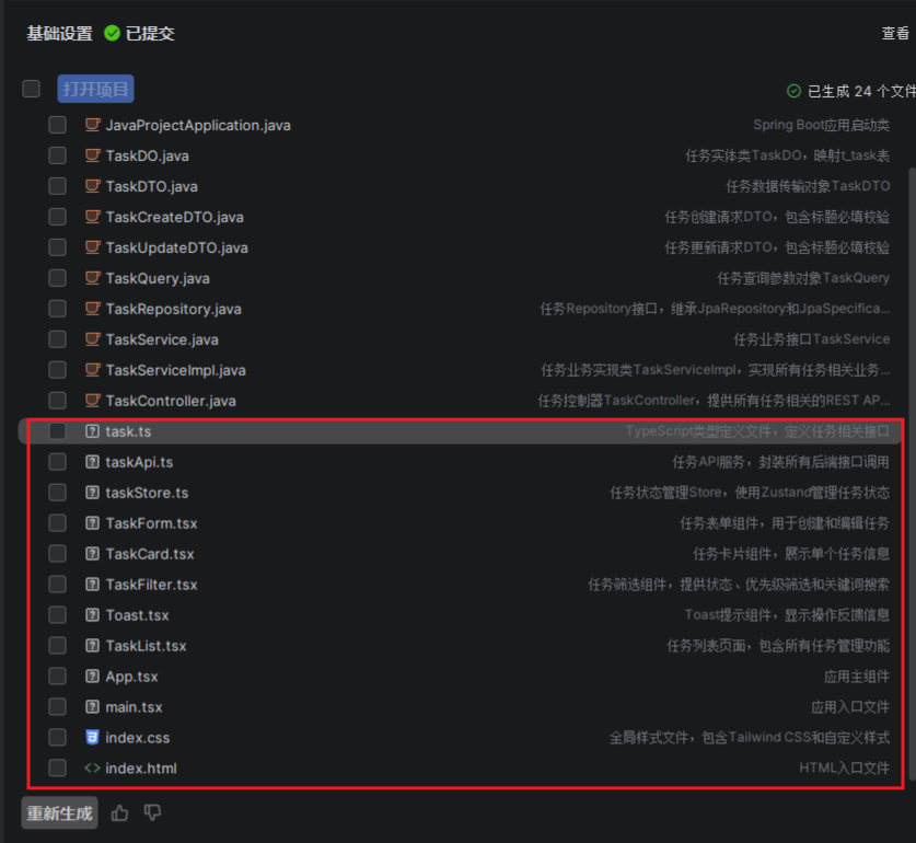 - 步骤五:直接生成对应的文件源码,包含所有计划的功能。等待所有文件生成后,方可选择文件,然后打开项目。