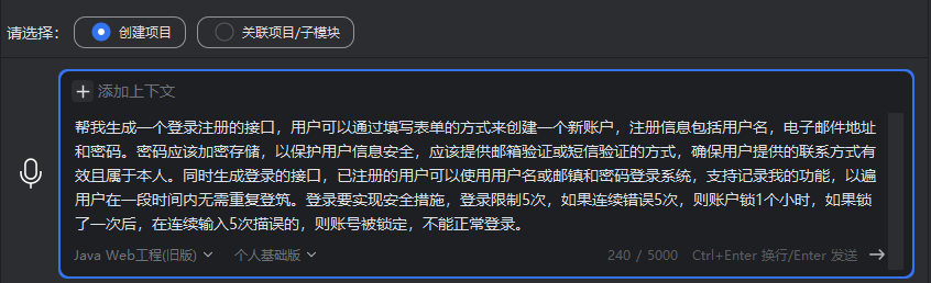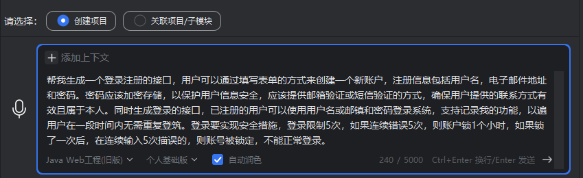 关联项目/子模块说明:只能关联到当前窗口已打开的项目中,若需要关联到其它项目,则需要先打开该项目后,再使用飞算JavaAI生成对应的需求。子模块只指当前项目下的模块。
