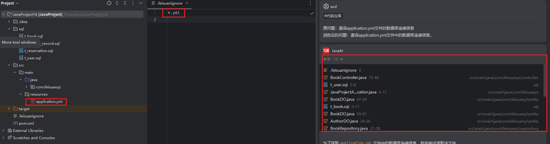 - 在智能会话中提问,使用#代码仓库,检索该文件的内容,搜索列表不会出现已忽略的文件。