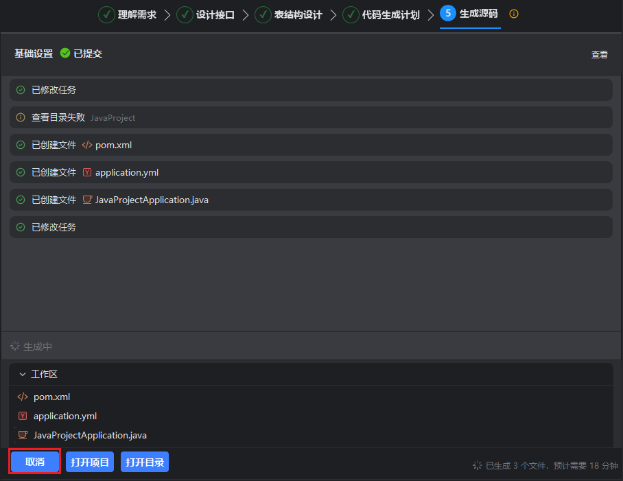在生成源码项目文件的过程中,您可以随时点击“取消”以终止后续源码文件的生成,但可能会导致项目不完整,请注意。