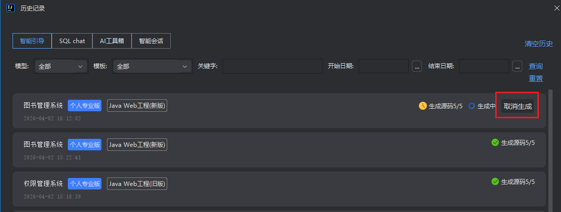 打开历史记录后,选择正在生成中的任务,单击“取消源码”即可。