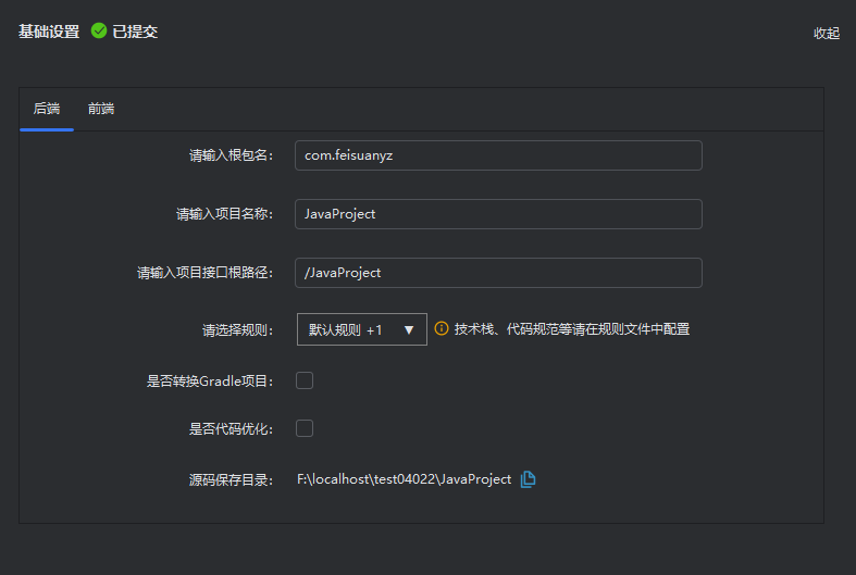 - 请输入根包名、项目名称、项目根路径(application中context-path路径)、以及选择规则文件,然后单击“开始生成”。
