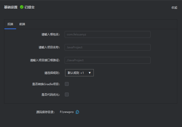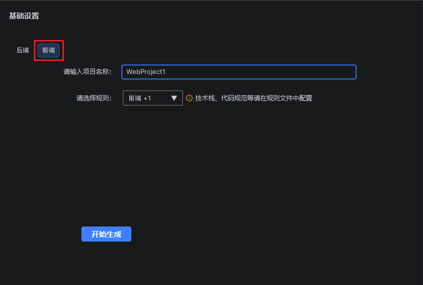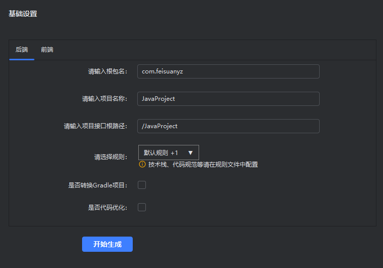 - 后端项目:请输入根包名、项目名称、项目根路径(application中context-path路径)、以及选择规则文件。 前端项目:请输入项目名称、和选择规则文件。