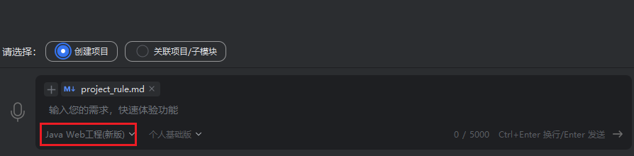 - 在输入需求描述的步骤时,选择“创建项目”,然后选择“Java Web工程(新版)”。