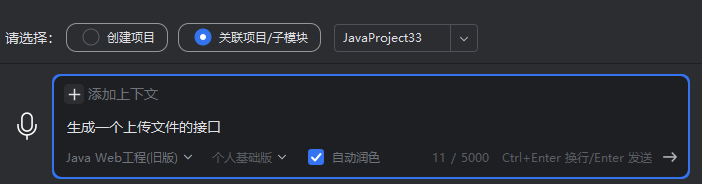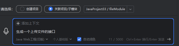 针对当前已打开的项目是父子模块的项目时,您可以选择合并到当前项目的父模块还是子模块。如果您选择了对应的子模块,则生成源码会合并到对应的子模块中。如果没有选择子模块,则模型会根据对需求上下文的理解及对模块的解析,若有合适的子模块,则会合并到该子模块中或者src目录下。若模型检测到都没有,则会新建一个模块存储生成源码的文件内容。