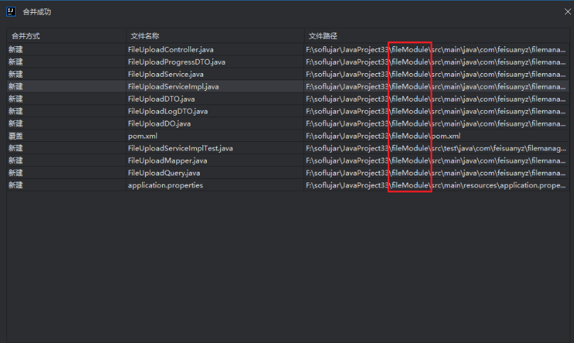 - 按照流程完成后续的步骤操作,源码生成结束,勾选所需文件,然后单击“合并代码”。已勾选的文件会合并到新建的模块下。