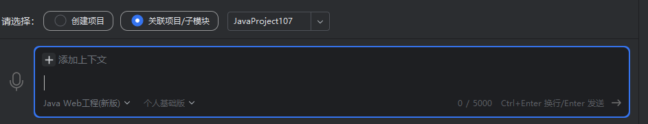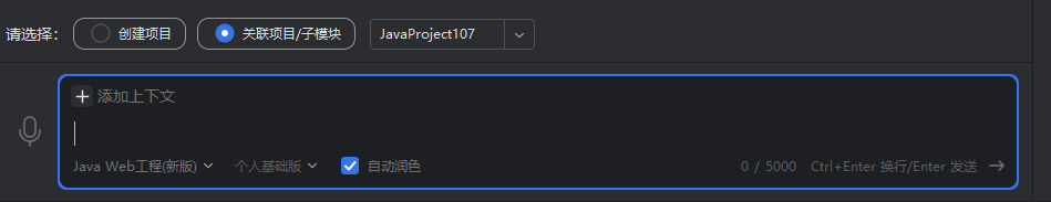 - 在第一步输入需求描述的步骤时,选择“关联项目/子模块”,然后在列表选择“项目”。然后选择“Java Web工程(新版)”。