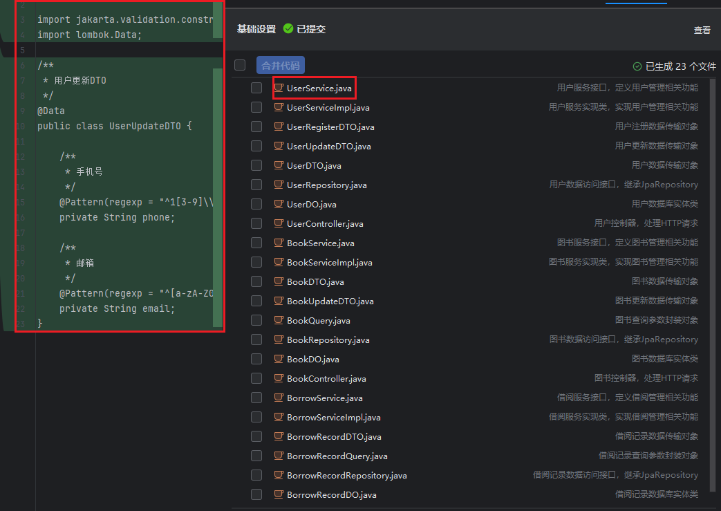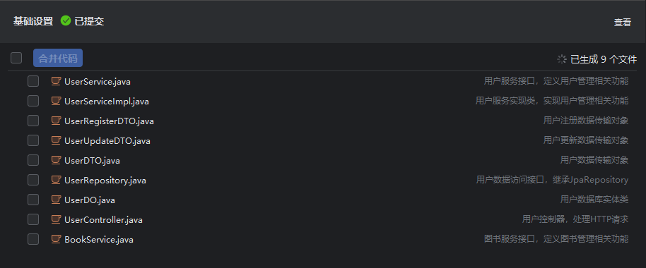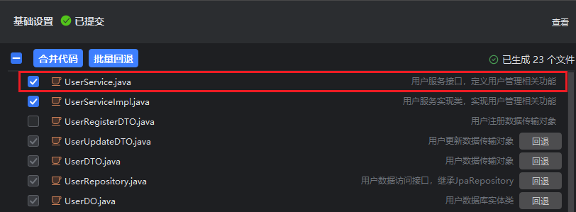 - 然后勾选所需的文件,单击“合并代码”,合并后,系统会把当前模块已勾选的文件自动进行合并,合并成功显示合并的文件及位置。