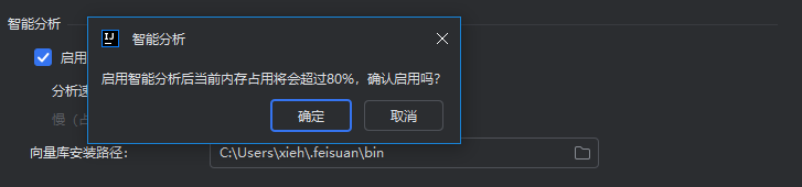 勾选“启动智能分析”后,或者在 IDEA 启动时,插件会自动评估系统资源。若检测到“智能分析所需内存”与“当前系统已用内存”之和超过总内存的 80%,系统将弹出预警提示。请您根据实际硬件状况谨慎选择是否开启。若在内存高负载状态下强制启用,可能导致系统响应迟缓、卡顿,从而严重影响开发体验。