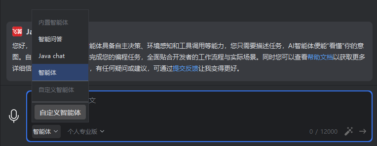 自定义智能体:您可以自定义智能体,灵活设定角色身份与行为规则,并基于这些自定义智能体进行提问,让它高效协助您完成任务或解答问题。例如,您可以将其定义为“Python 工程师”等特定角色。与系统内置的智能体不同,系统内置的主要面向 Java 项目制定规则;若您的项目基于 Python 或其他技术栈,系统默认智能体可能无法满足需求。此时,通过自定义智能体,您就能精准适配自身项目的上下文与要求,获得更贴合实际的帮助。
