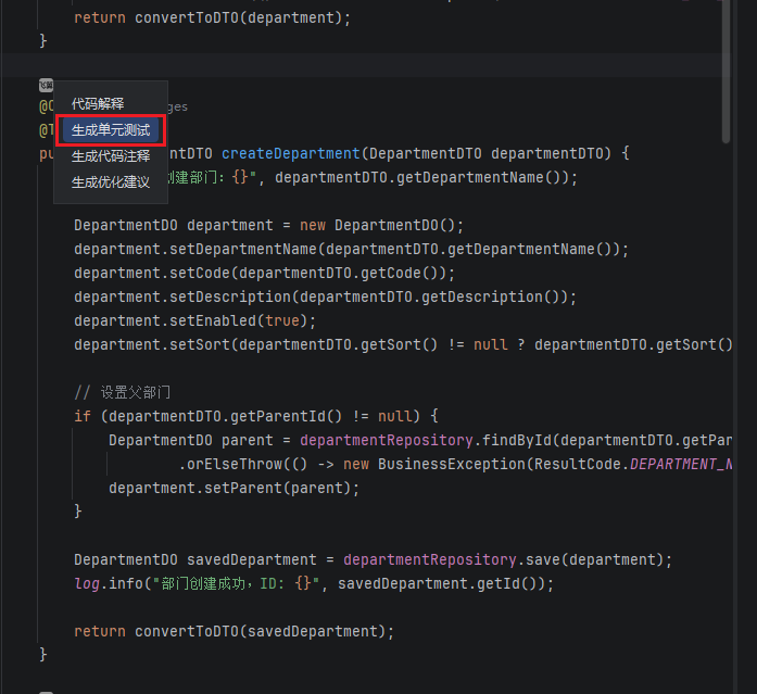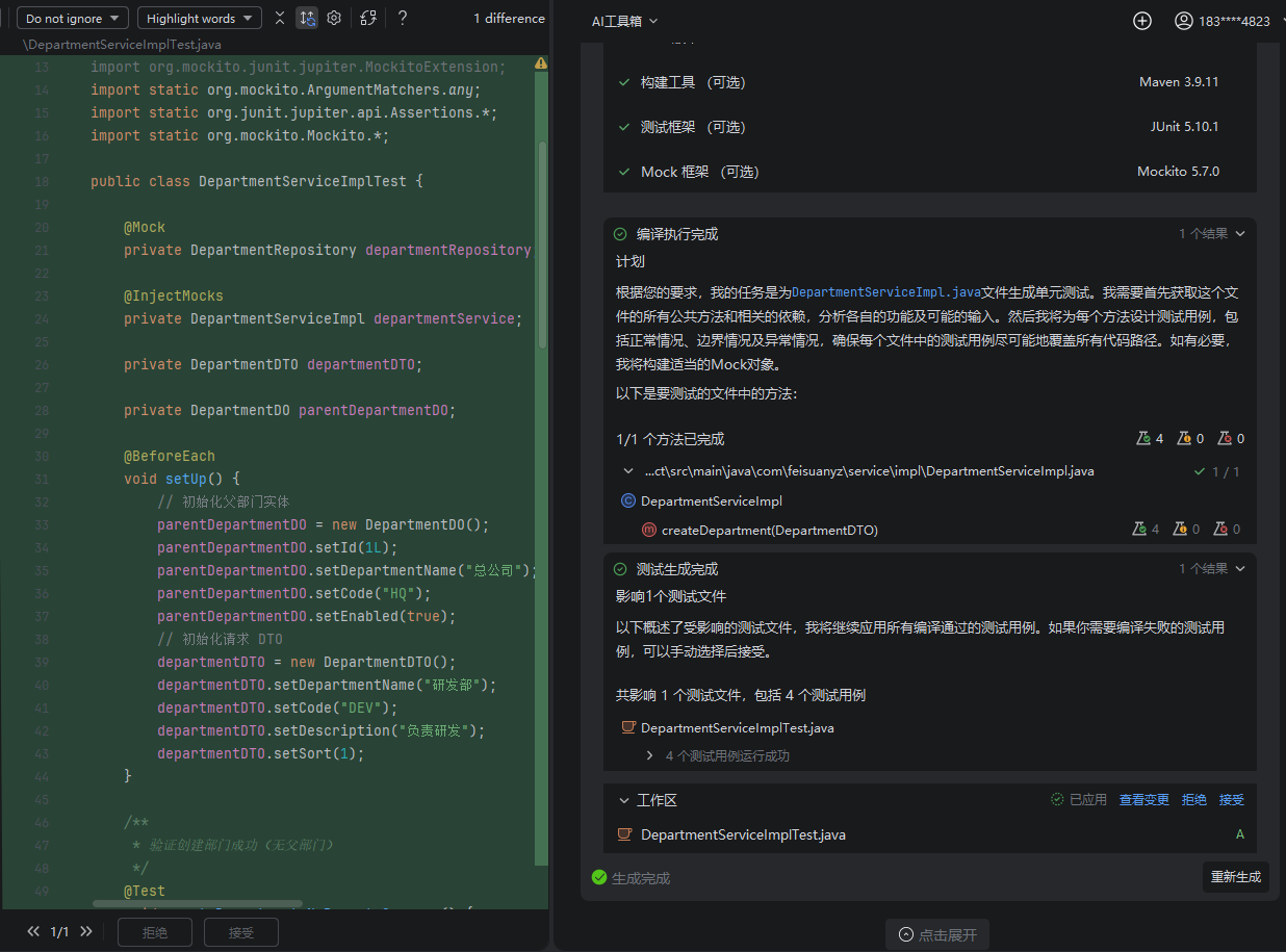 通过自动生成单元测试功能,您可以快速为Java方法创建测试用例。只需选择目标方法,系统将自动分析其逻辑并生成高质量的测试代码。这一功能不仅智能解析输入参数和返回值,还会针对多种场景生成测试数据,确保全面覆盖潜在问题,帮助您高效提升代码质量和稳定性。