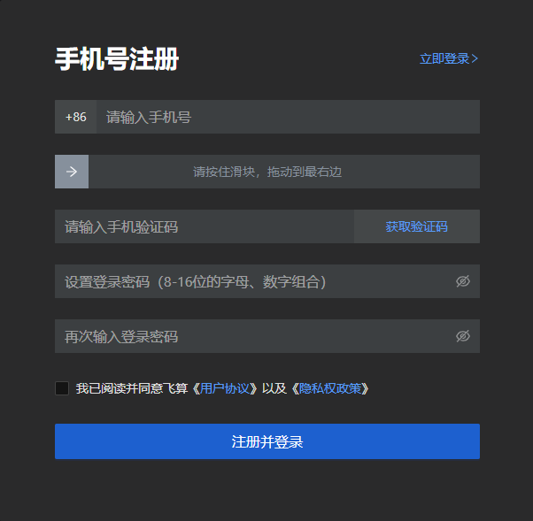 说明: 登录密码的规则为8-16位的数字和字母组合,在注册前需阅读飞算《用户协议》和《隐私权政策》,阅读完后勾选即可。