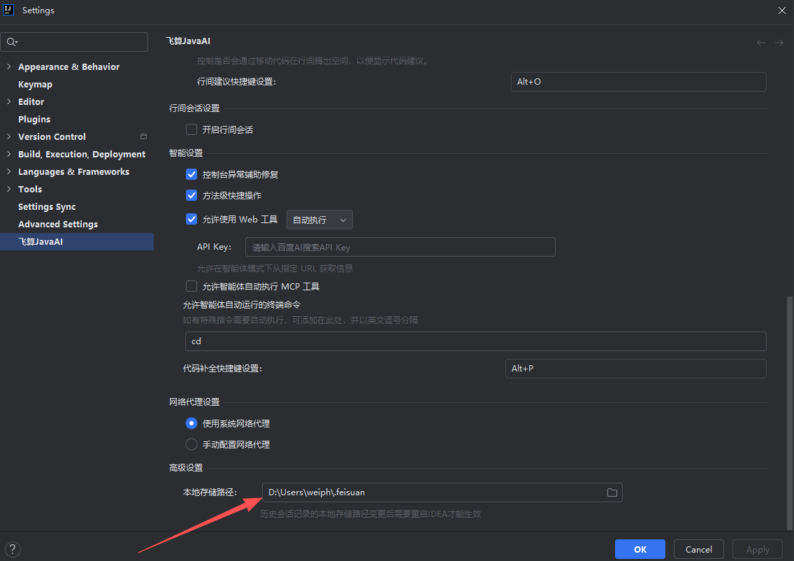 答:打开飞算Java AI的“高级设置”,查看高级设置中的本地存储路径,找到该路径下的.feisuan目录,打开logs文件,日志信息存储在javaai.log文件中。