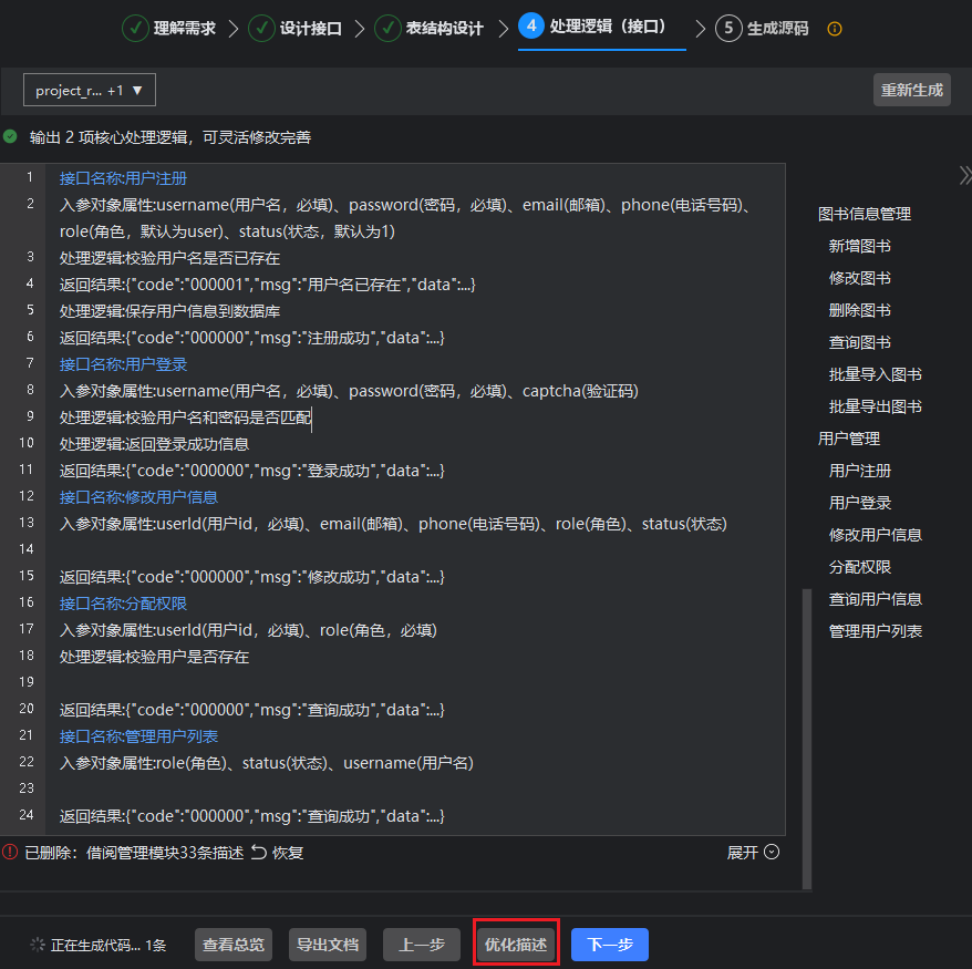 优化描述指的是在修改接口处理逻辑后,系统将对更新后的需求进行整理和润色,确保处理逻辑的上下文流畅且清晰。最终,系统会基于优化后的需求重新生成源码项目。